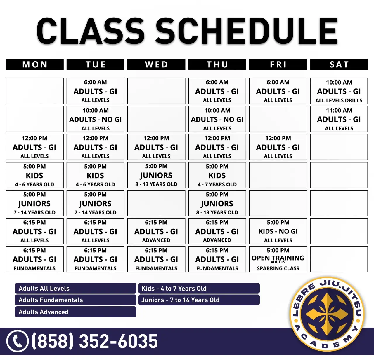 Stay on track with your training at Lebre Jiu-Jitsu. Our schedule is designed to offer classes for all ages and skill levels, providing flexibility to fit your routine. Whether you’re just starting or preparing for competition, you’ll find the right class to support your goals.
